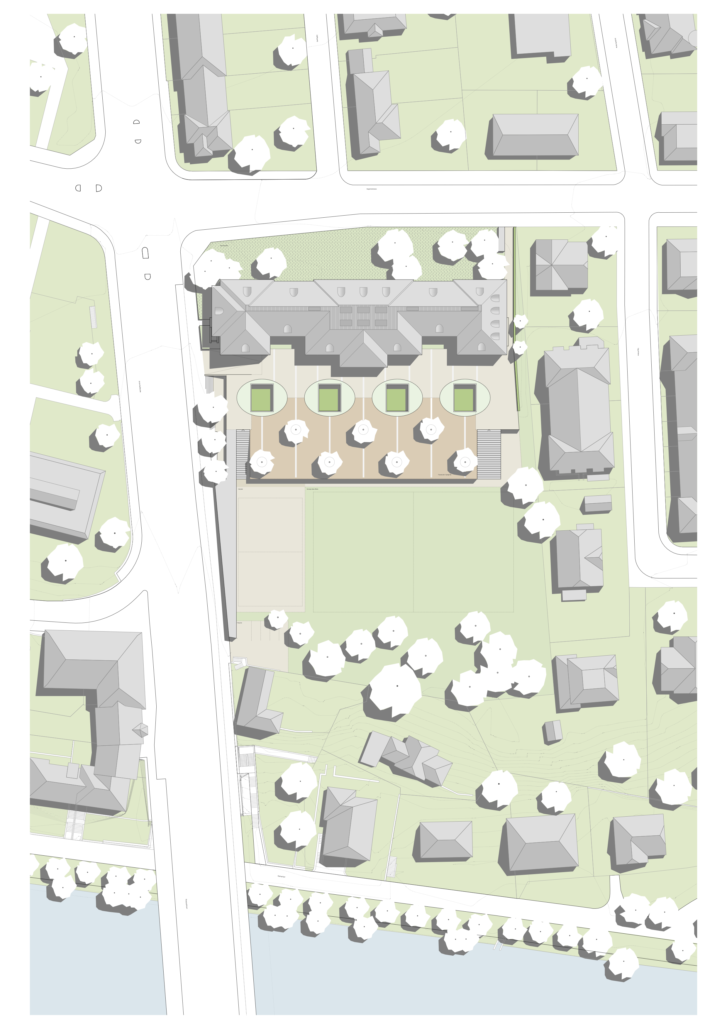 Der geforderte zusätzliche Raumbedarf mit Tagesbetreuung und zwei neuen Turnhallen wird direkt an den Altbau gerückt. Der halbversenkte Neubau erweitert den darüberliegenden Pausenplatz zu einer grosszügigen Terrasse. Der Sockel ist Teil des Gebäudes und unterstreicht dessen repräsentative Wirkung zum aareseitigen Freiraum. Die neue Situation ist eine funktionierende Abfolge unterschiedlicher nutzbarer Aussenräume und entspricht der ursprünglichen, städtebaulichen Konzeption. Respektiert werden die weiträumigen Sichtbezüge, welche nicht mehr durch ein Gebäude an der Kirchenfeldstrasse verstellt werden.